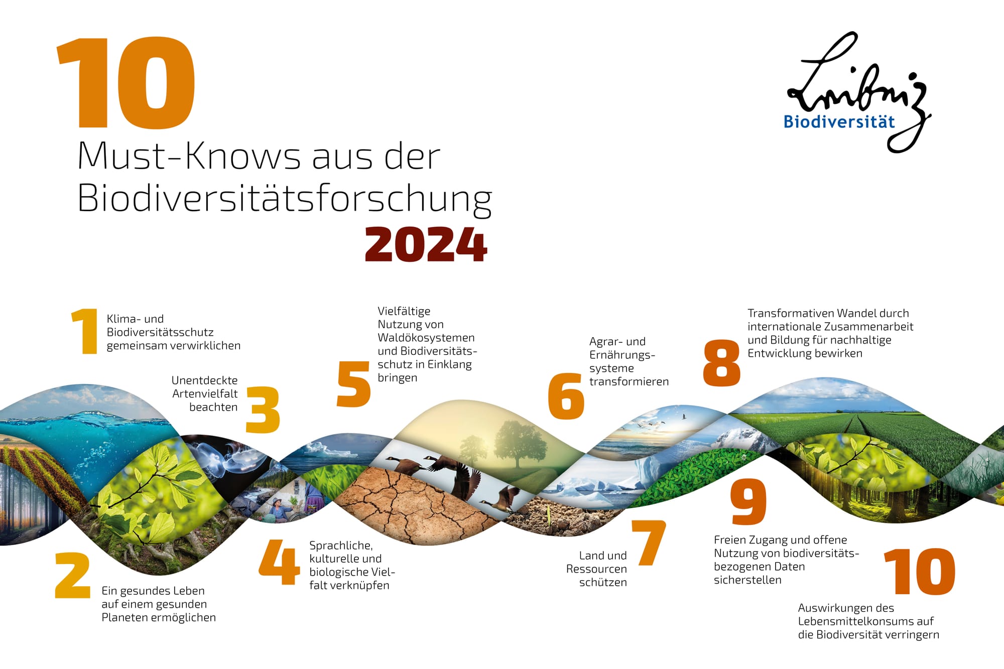 Das Leibniz-Forschungsnetzwerk Biodiversität hat in den 10 Must-Knows aus der Biodiversitätsforschung 2024 in zehn Schlüsselbereichen des Erde-Mensch-Systems wissenschaftliches Wissen fundiert aufgearbeitet und mit konkreten Empfehlungen versehen, wie wir als Gesellschaft zu einem gesunden Leben auf einem gesunden Planeten beitragen können.